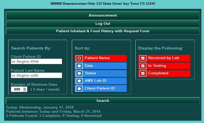 The Allermetrix Client portal allows you to search for your patients using various search protocols as demonstrated below