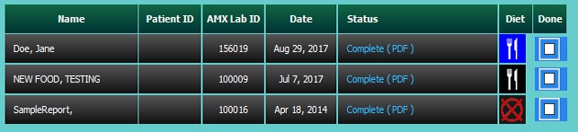Our PDF test results can be directly downloaded into your EMR. The "Done" checkbox can be used to indicate when a record has been reviewed or posted to the EMR. Additionally, for patients that have positive food tests, you have the ability to create a rotation/elimination diet by simply selecting the "knife & fork" image. Results are automatically transfered and a diet plan is presented, which can be modified to meet each patients individual needs.